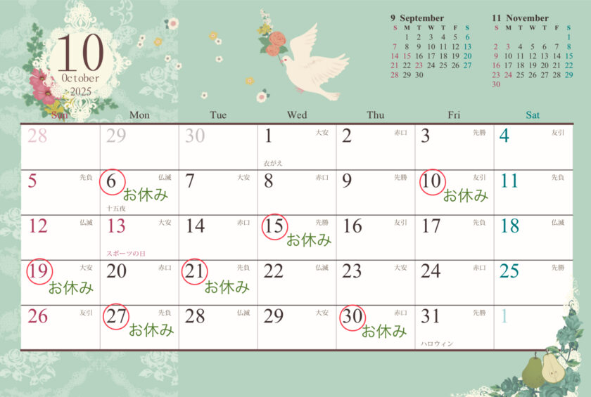 6日(月)、10日(金)、15日(水)、19日(日)、21日(火)、27日(月)、30日(木)となります。